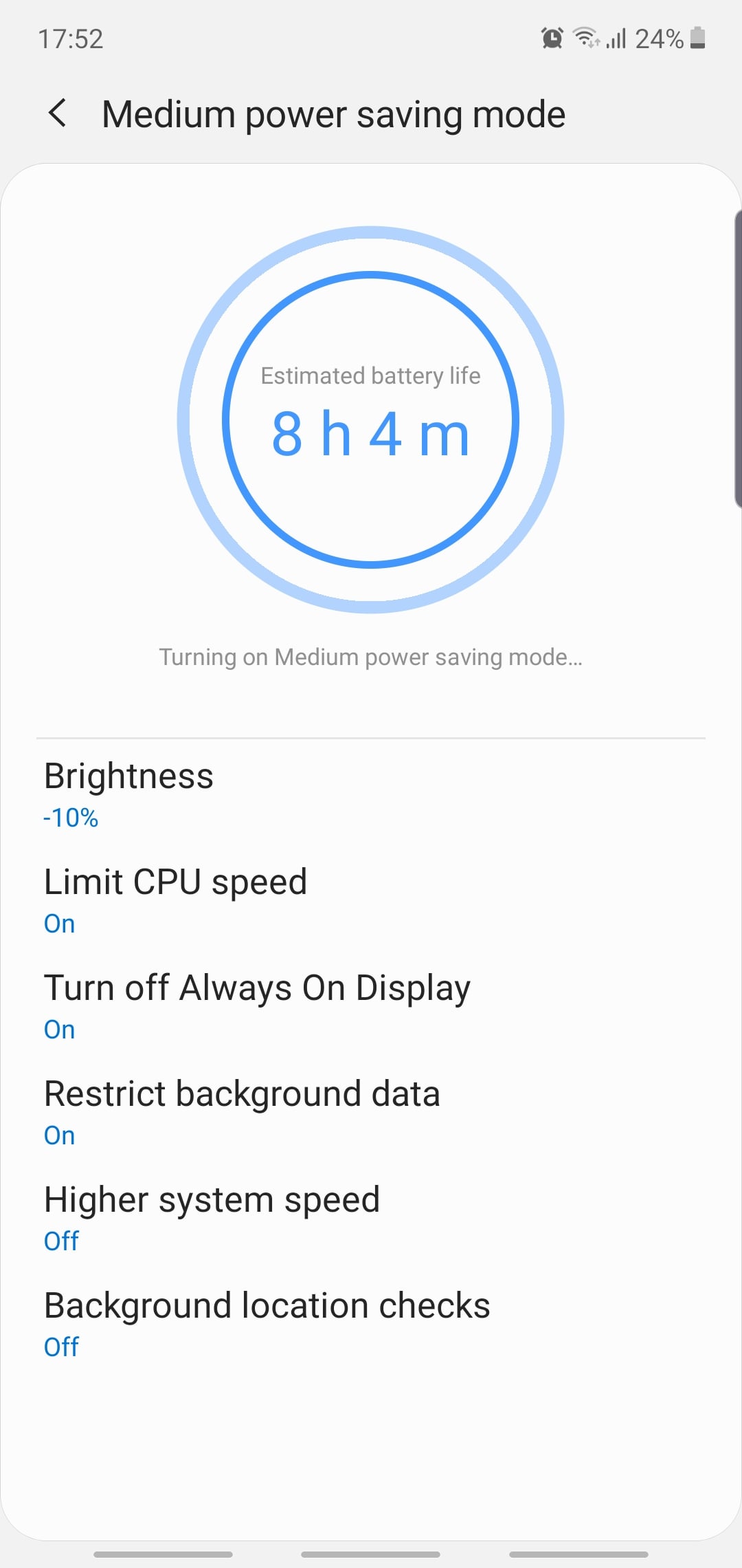 For the purpose of this guide, there’s no reason to pick High performance or Optimized, but Medium and Maximum power saving modes can make a considerable difference for your phone’s battery life. Both modes achieve this by limiting your CPU speed, lowering display brightness, disabling background data, and more.